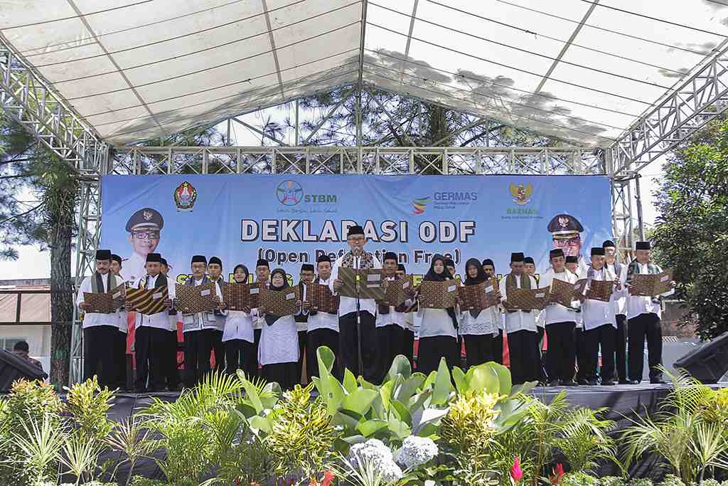 Kepala Desa Rejosari Slamet Prabowo (tengah) memimpin pembacaan deklarasi Open Defecation Free (ODF) atau deklarasi tidak membuang air besar sembarangan dalam acara pencanangan Kampung Keluarga Berencana di Desa Purwosari Kecamatan Kranggan Kabupaten Temanggung, Kamis (4/4/2019). Deklarasi ODF menyebutkan bahwa masyarakat siap mempertahankan dan meningkatkan pola hidup bersih serta sehat guna mencapai derajat kesehatan yang tinggi. MC Kab Temanggung/Agung