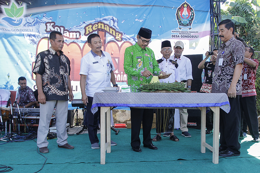 Bupati Temanggung HM Al Hadziq (tengah) memotong tumpeng sebagai simbol membuka objek wisata Simpleng Waterpark di Desa Gondosuli Kecamatan Bulu Kabupaten Temanggung, Rabu (12/6/2019). Dengan membayar tiket Rp8.000,00 pengungjung dapat menikmati dua kolam renang dewasa dan anak-anak dengan background pemadangan Gunung Sumbing. MC Kab Temanggung/Agung