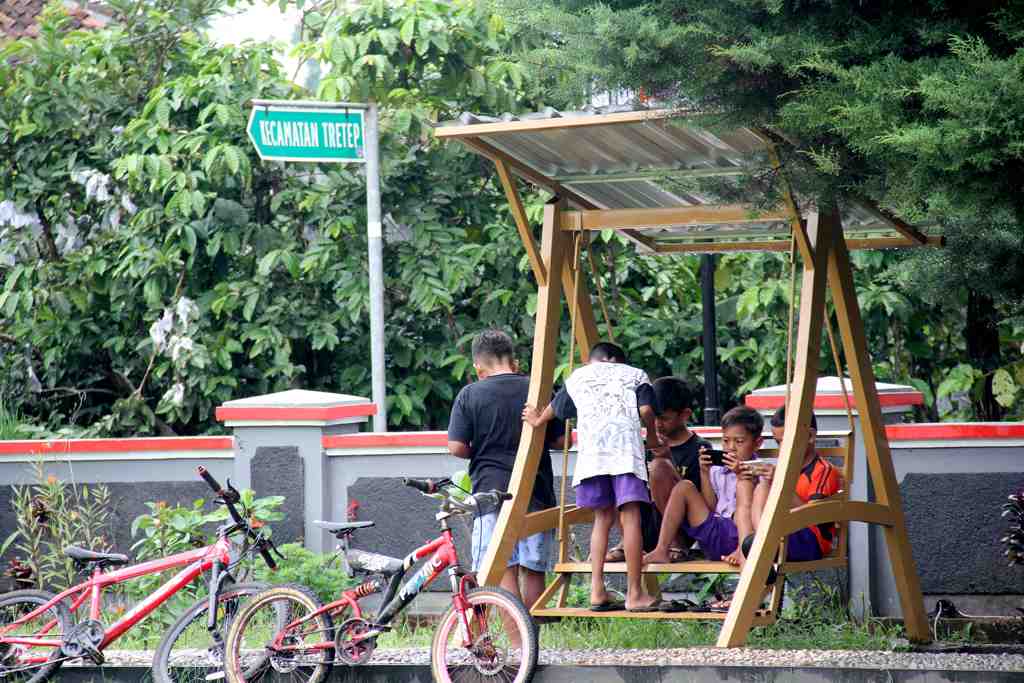 Sejumlah anak Sekolah Dasar memanfaatkan fasilitas wifi gratis yang disediakan kantor Kecamatan Tretep Kabupaten T..