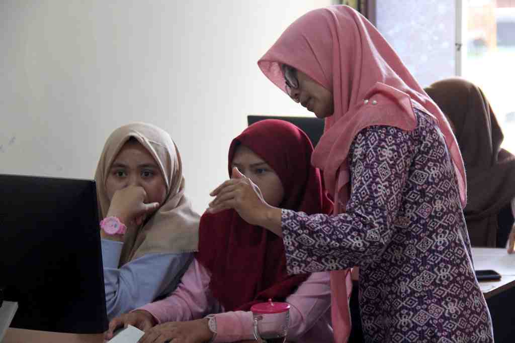 Neli Muflihah (kanan) mengajar teknik dasar komputer dan memberi pengarahan kepada pengunjung di Pusat Komunikasi dan Informasi Keca..