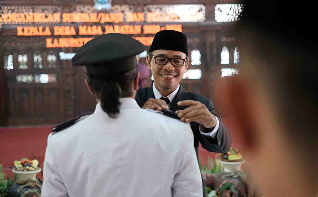 Kepala Desa terpilih saling membantu memasang pangkat jabatan sebagai tanda telah resmi menjadi kepala desa setelah selesai dilantik..