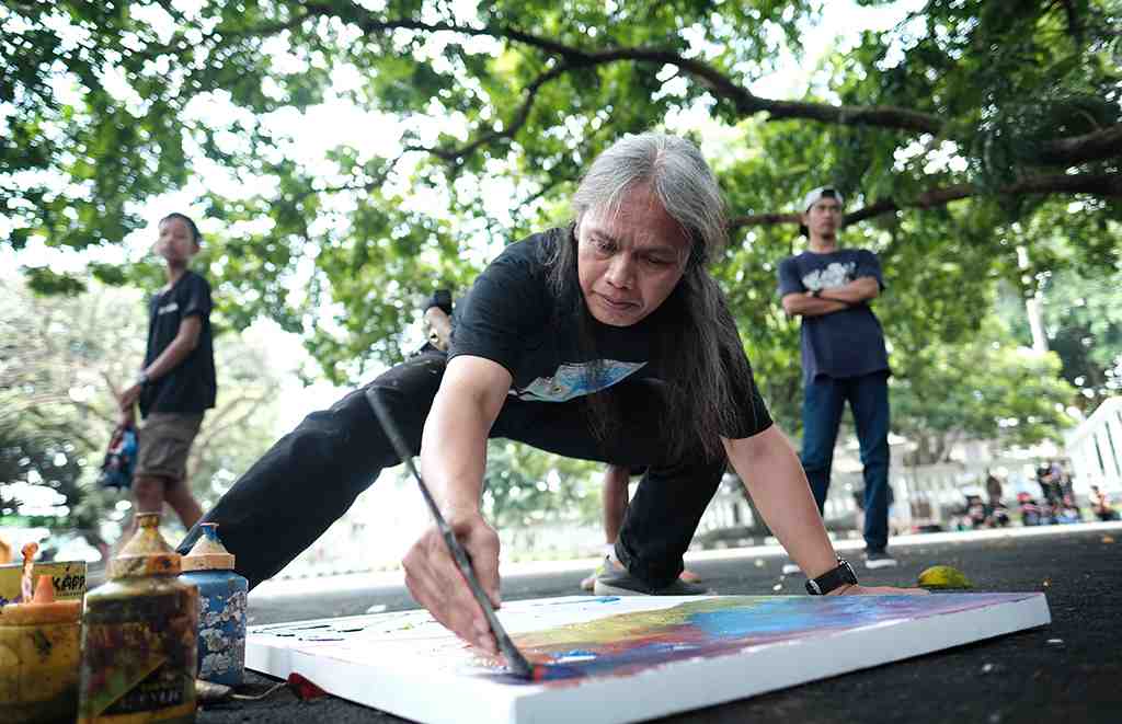 Sugiarto atau pak cilik melukis pepohonan di atas kanvas pada acara melukis on the spot yang diadakan Creativitas Anak T..