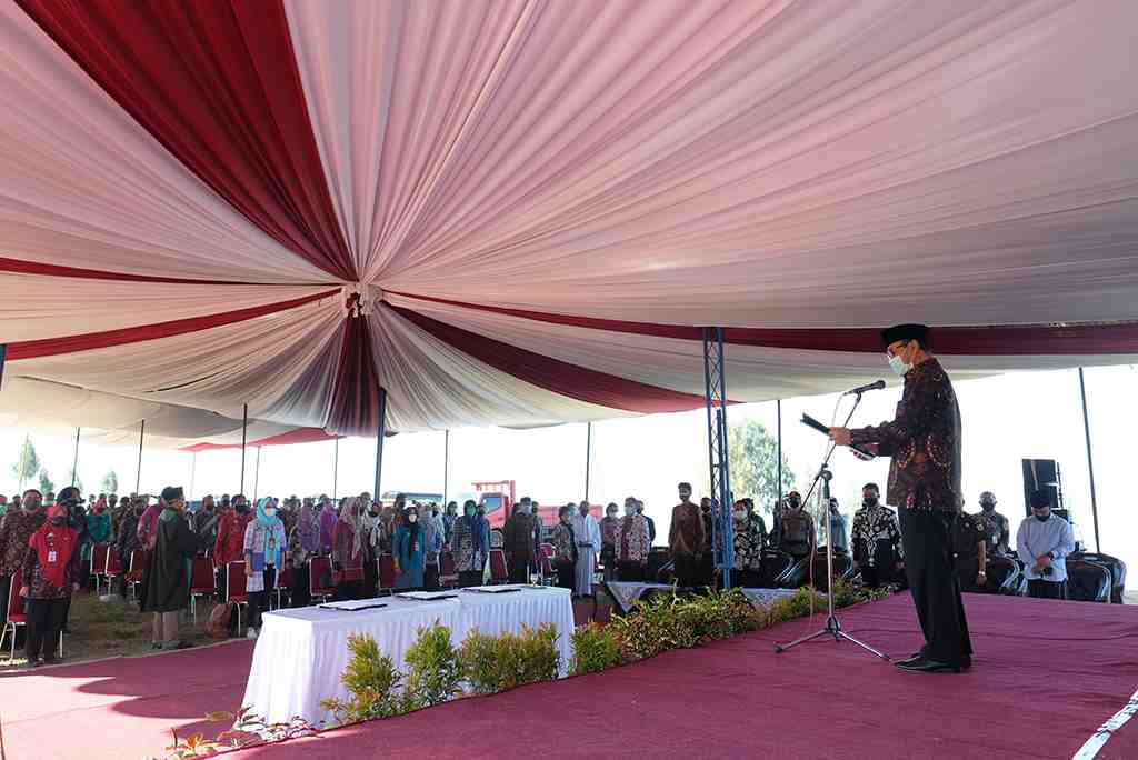 Bupati Temanggung HM Al Khadziq(kanan) membacakan janji pejabat fungsional dan ditirukan peserta yang akan dilantik sebelum dilakuka..