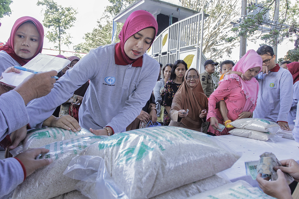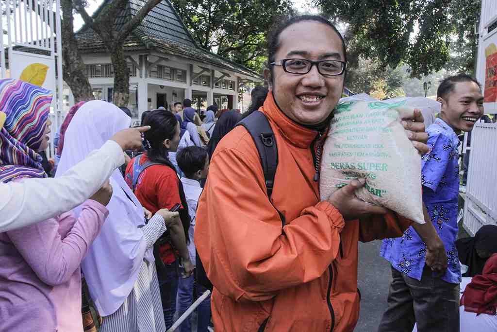 Seorang warga menunjukkan beras bersubsidi yang sudah dibeli dalam Pasar Murah di Depan Pendopo Kabupaten Temanggun..