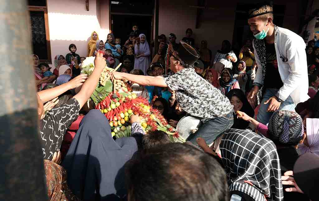 Warga berebut gunungan khoul Paku Aji ke-5, yang terbuat dari hasil bumi setelah gunungan diarak keliling desa dan didoakanoleh ulam..