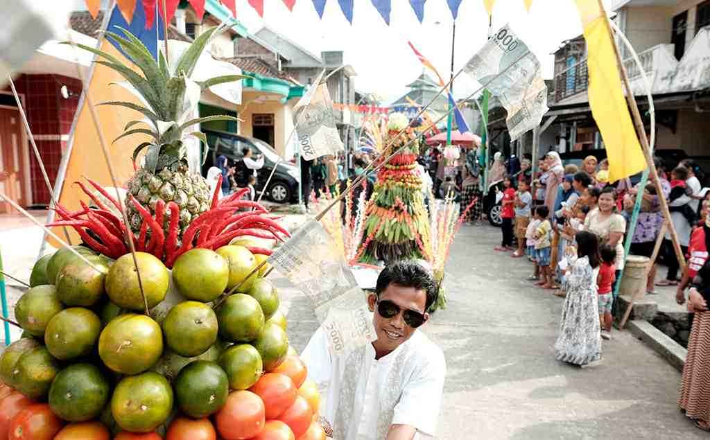 Gunungan dari hasil bumi dalam Khoul Simbah Paku Aji dibawa oleh peserta keliling desa di Desa Dangkel, Kecamatan Parakan, Kab..