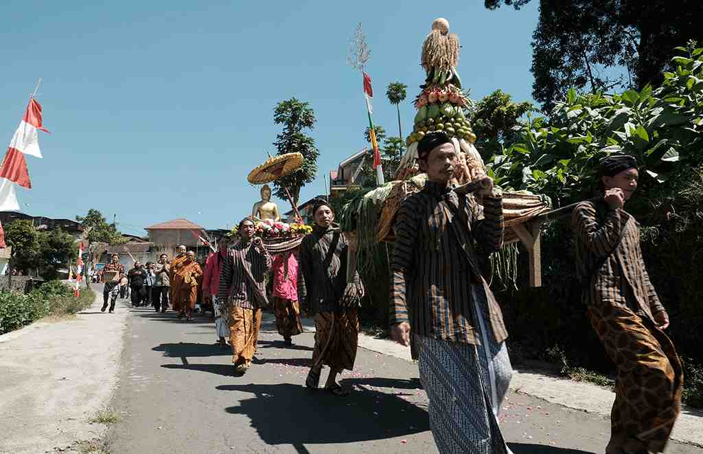Gunungan dan patung Budha diarak menuju Vihara Virya Damma Rata dalam kirab Tri Suci waisak dan Sedekah Bumi di Desa Cemoro, Kecamat..