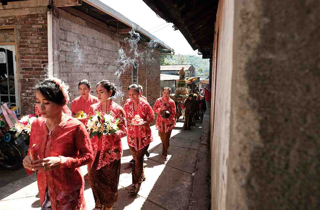 Pembawa bunga tabur dan lambang Garuda bersiap di gang area pemberangkatan kirab Tri Suci waisak dan Sedekah Bumi di Desa Cemoro, Ke..