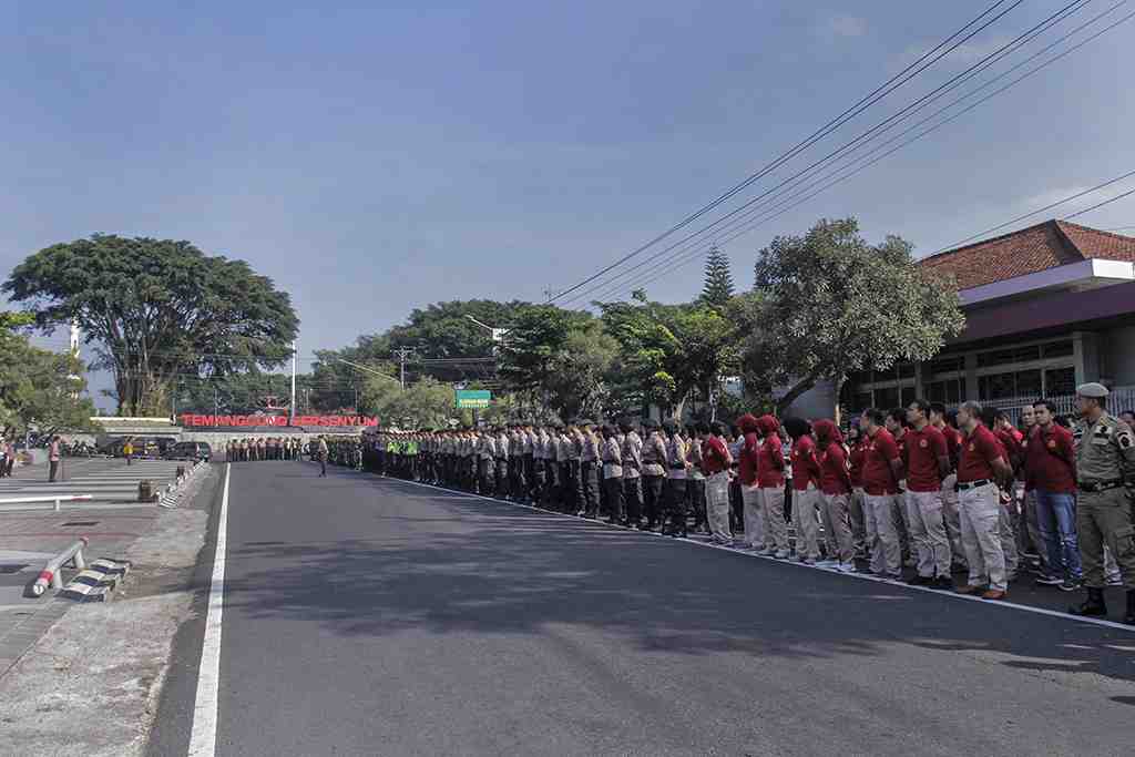 Empat petugas satuan Direktorat Kepolisian Satwa mengikuti Apel Kebangsaan untuk bersiaga di Temanggung pasca penetapan hasil r..