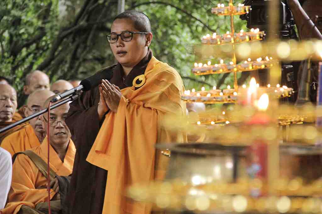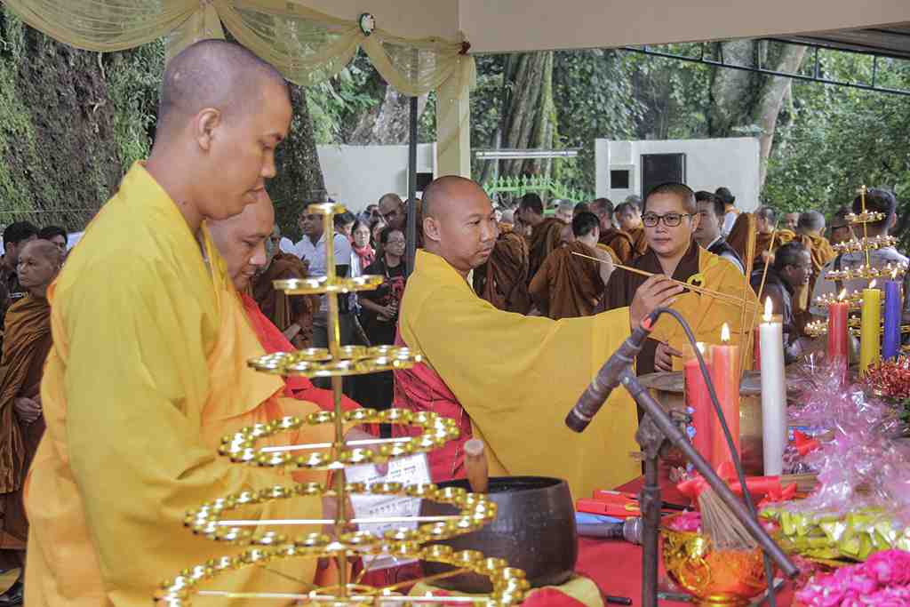 Salah seorang Bhikku memimpin jalannya doa sebelum memasuki posesi pengambilan air suci (berkah) untuk rangkaian perayaan ..