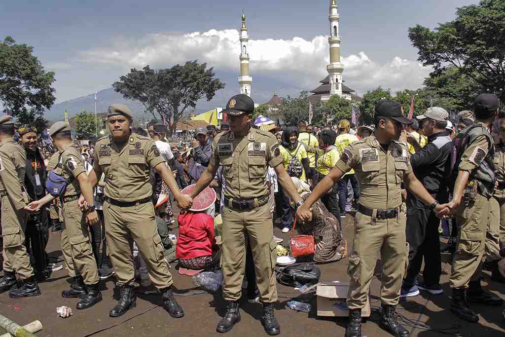Sejumlah anggota Satuan Polisi Pamong Praja (Satpol PP) mengamankan jalannya acara Wiwit Mbako Merti Bumi Phala atau ..