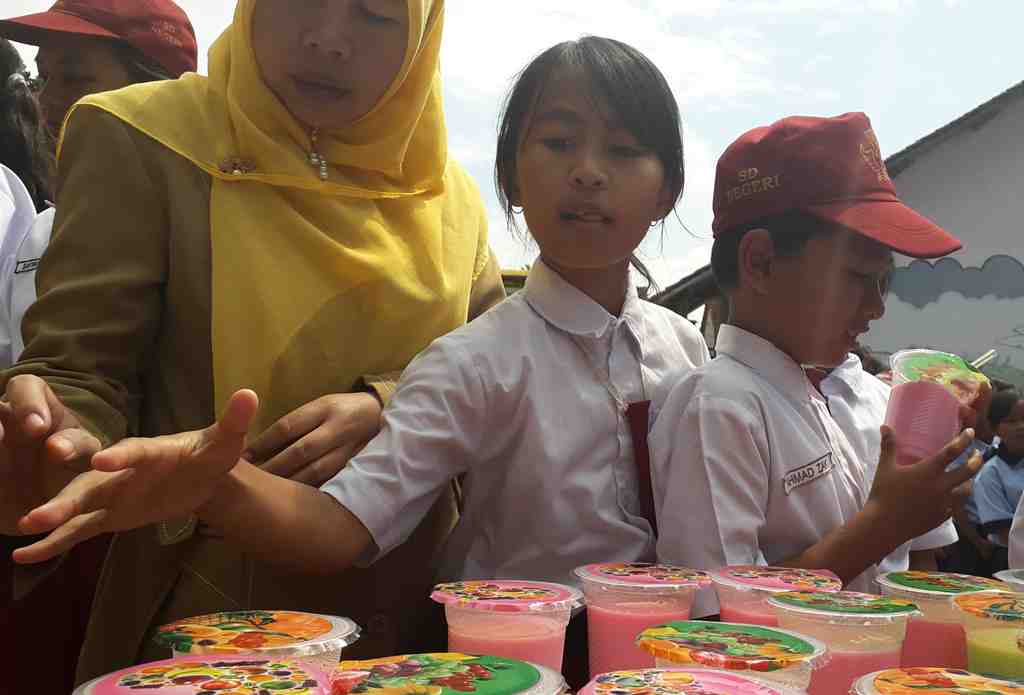 Sejumlah murid SD Negeri Nampirejo Kecamatan Temanggung mengambil susu yang dibagikan secara gratis dalam rangka Pencanangan B..