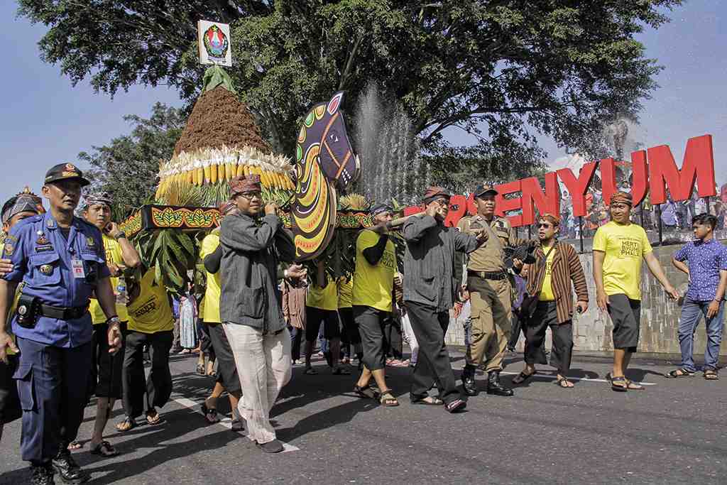Sembilan anggota Satuan Polisi Pamong Praja (Satpol PP) wanita berbaris sambil membawa bendera untuk mengiringi kirab tumpeng a..