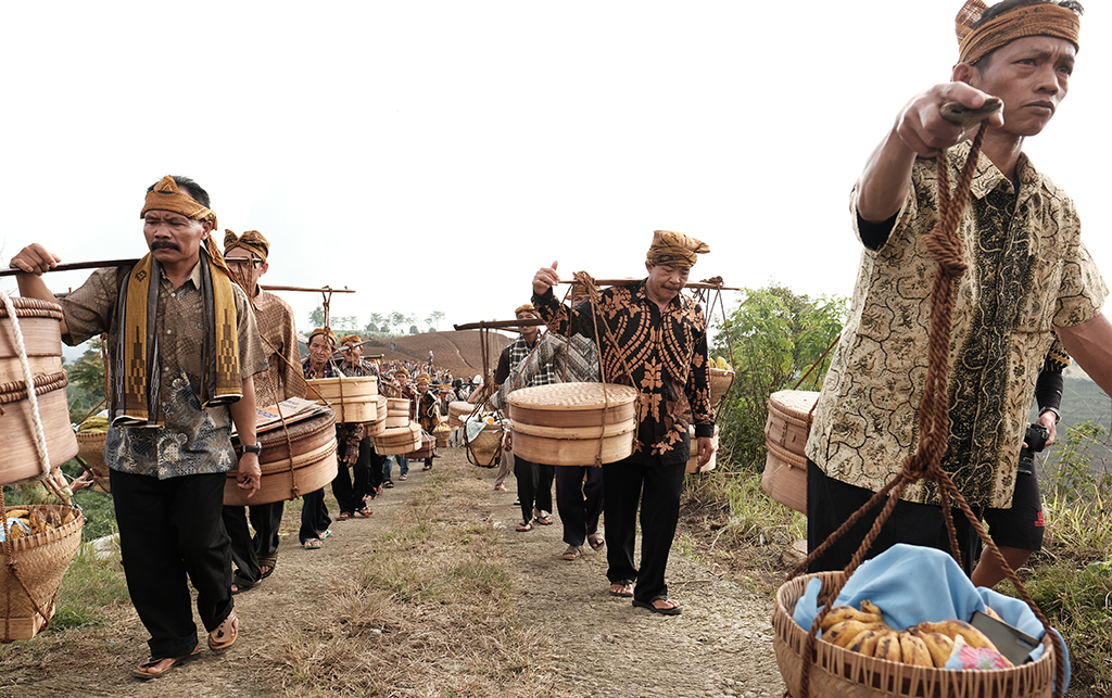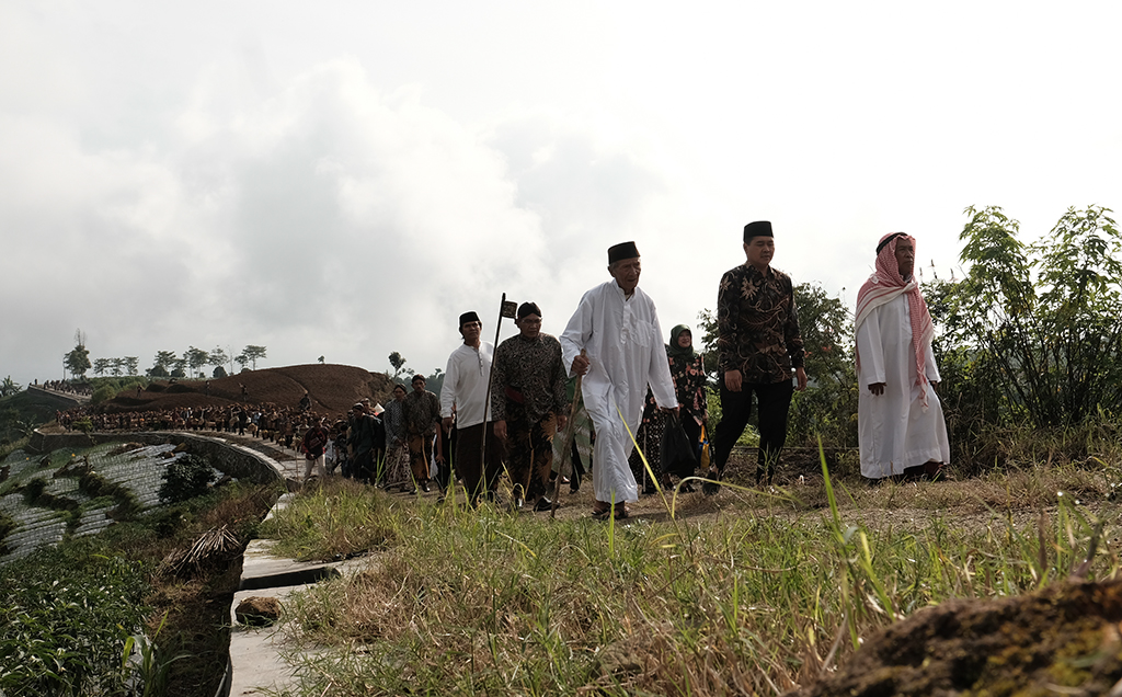 Warga Desa Cepit, Kecamatan Bulu, Kabupaten Temanggung, dipimpin sesepuh desa berjalan menuju bukit Plabengan dengan membawa tenong ..