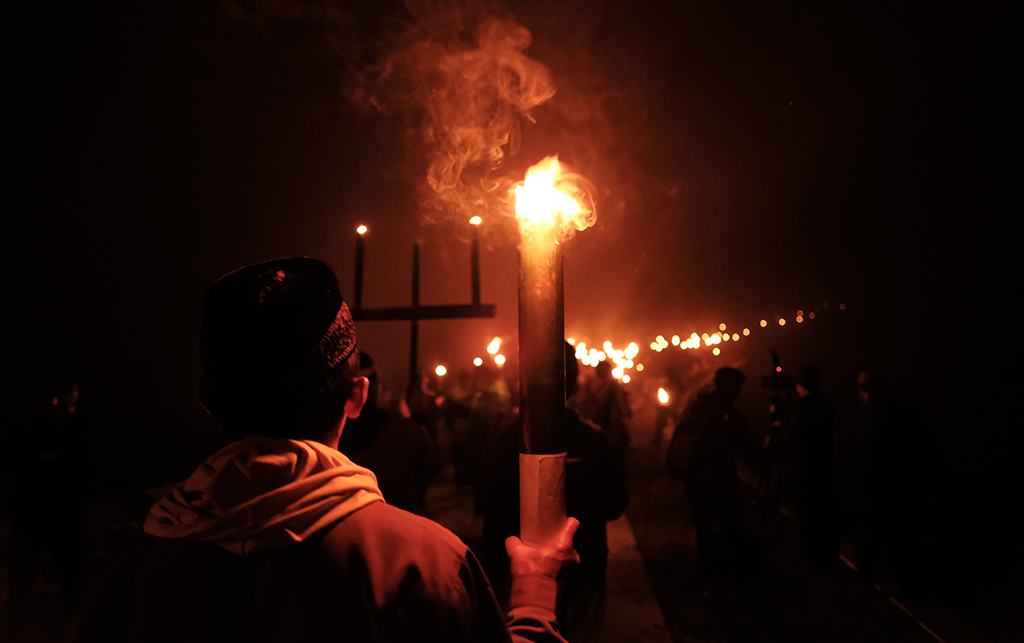 Sejumlah warga yang mengikuti acara tahlil oncor menyalakan oncor (penerangan terbuat dari bambu) s..
