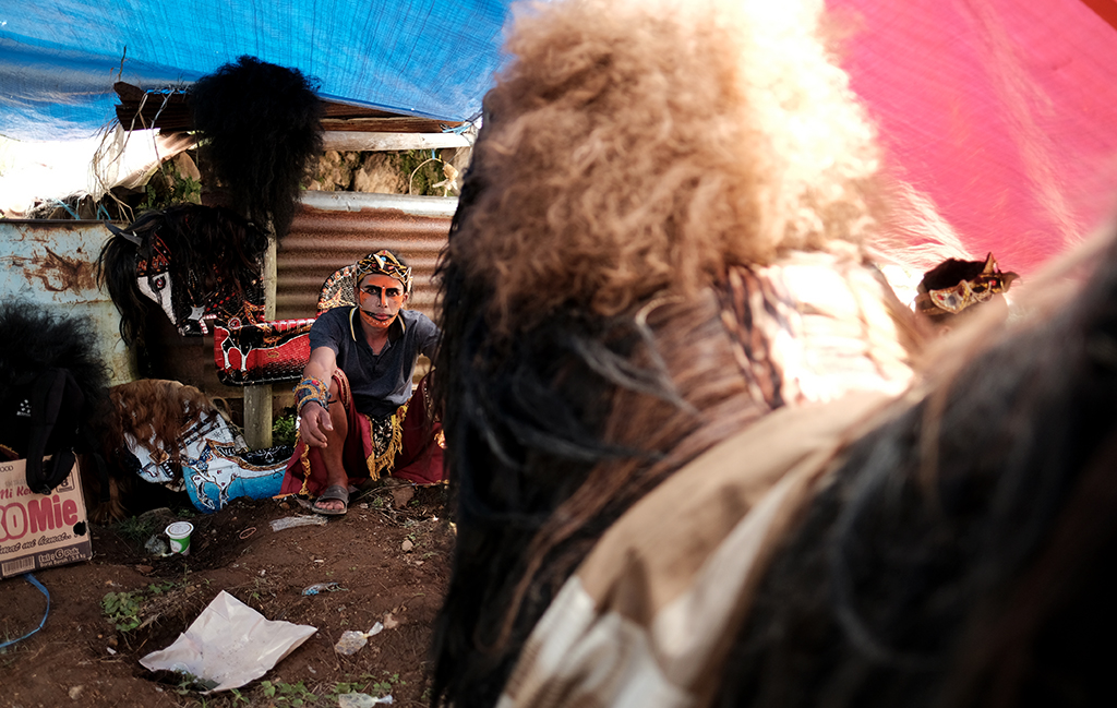 Penari kuda kepang menunggu giliran tampil dalam acara mengawali tanam tembakau, di Lereng Gunung sumbing..