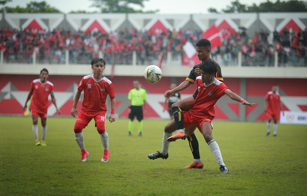 Pemain tuan Rumah Temanggung Persitema (baju merah) berebut bola gengan pemain dari Persipura, dalam laga..
