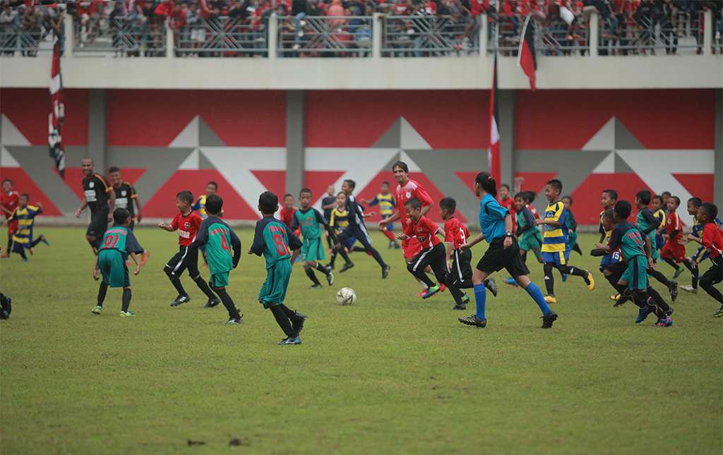 Pelatih Persipura Luciano Leandro (tengah baju merah) melakukan pertandingan hiburan melawan 100 murid Se..