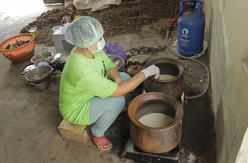 Seorang karyawan mengaduk adonan produk minuman sari lemon di pabrik rumahan di Komplek Perumahan Maron Permai Temanggung, Rabu (27/..