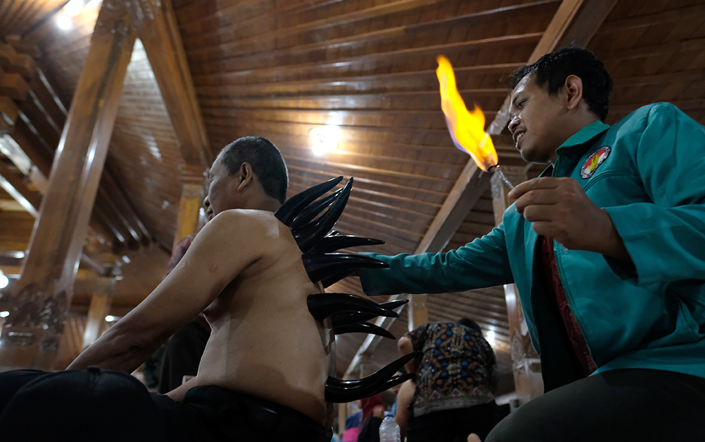 Muclasin (kanan) terapis bekam dan kiropraksi dari Yayasan Penyehat Tradisional Indonesia (YAPENTRI) memberikan layanan pengobatan b..