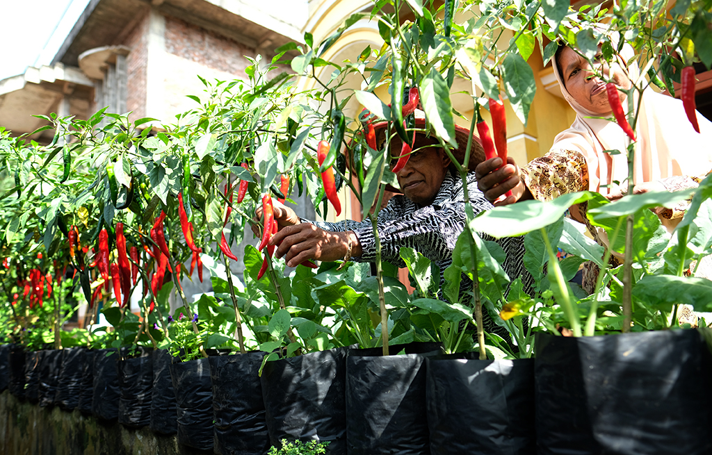 Wiyono beserta istri memetik cabe yang ditanam di pekarangan rumah menggunakan polybag, di Desa Kembangsari, Kecamatan..
