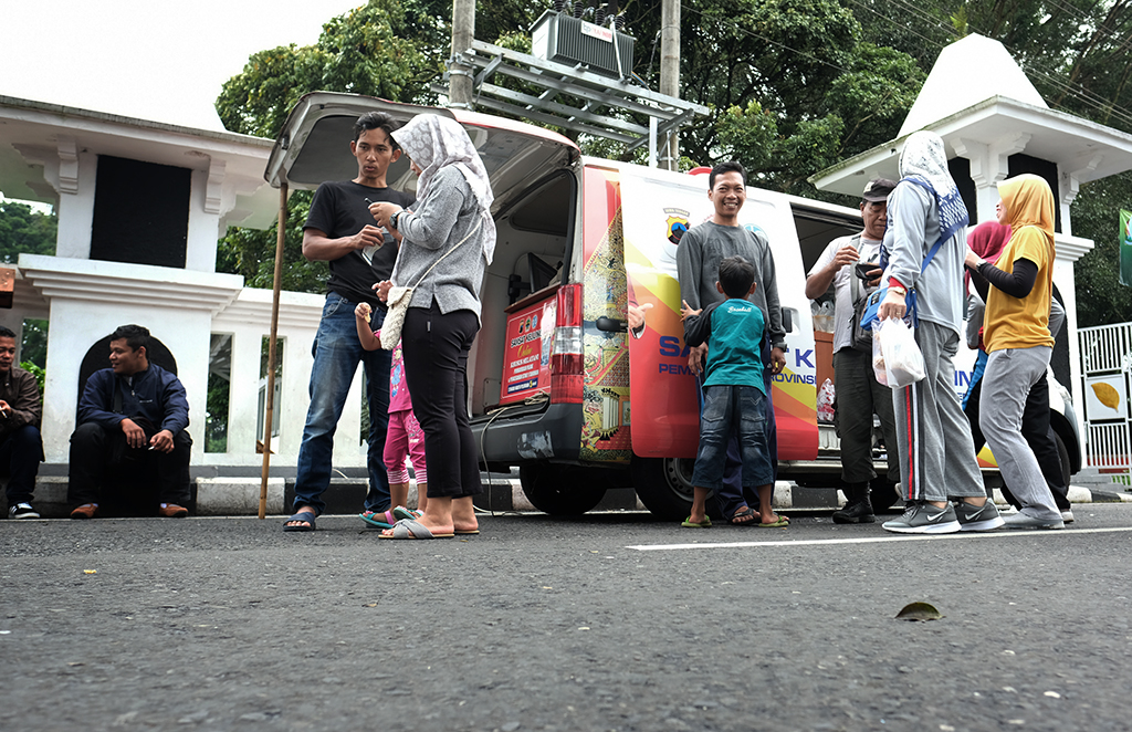 Sejumlah warga antri di dekat mobil pelayanan perpanjangan pajak kendaraan bermotor di Depan Pendopo Pengayoman Temanggung, Minggu (..