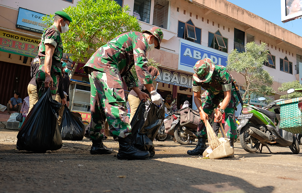 Anggota Komando Kodim 0706 Temanggung membersihkan sampah di Area Pasar Kliwon, Kabupaten Temanggung, Selasa (26/2/2019). Kegi..