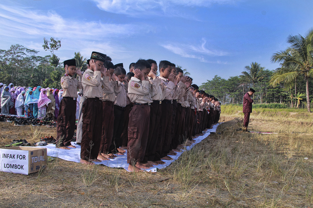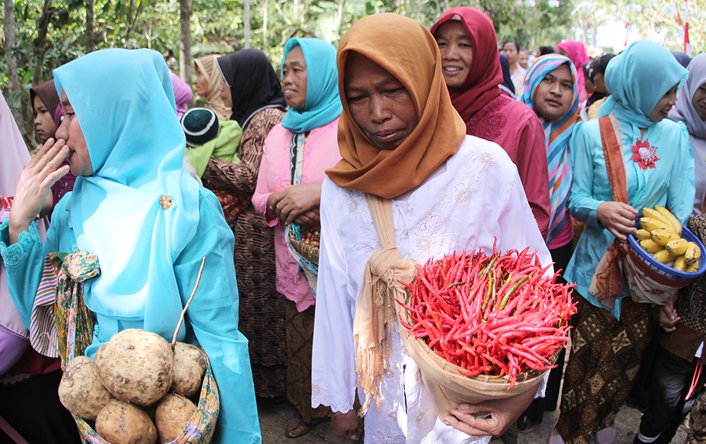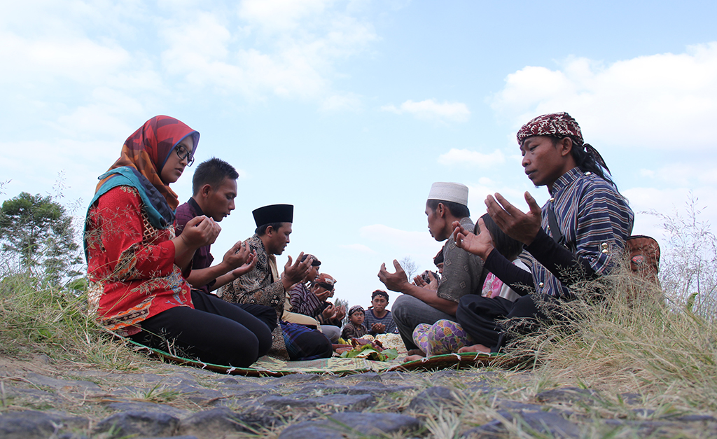 Kepala urusan Kesra Suyudi (berdiri tengah) mendampingi sesepuh desa untuk melakukan upacara bakar kemenyan di tengah ladang tembaka..
