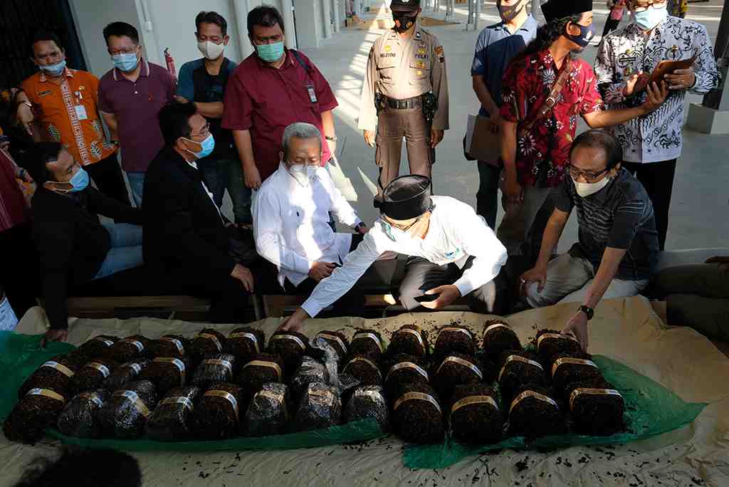 Dirjen Hortikultura Kementerian Pertanian Suwandi (kedua kiri) memukul kentongan membuka Soropadan Agro Expo (SAE) 2019 di Kec..