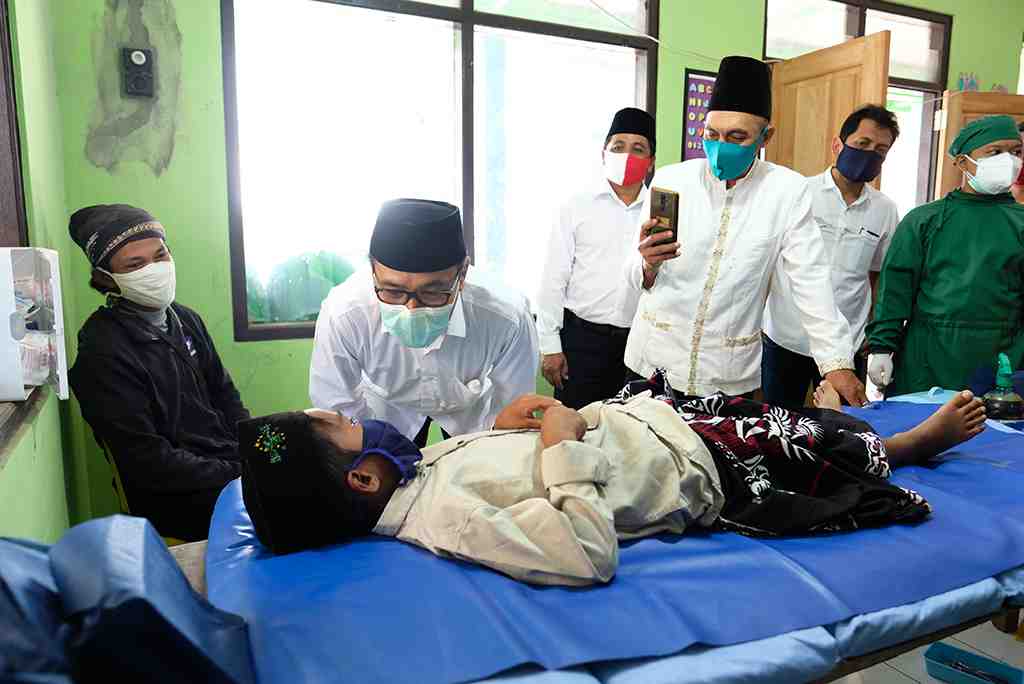 Bupati Temanggung M Al Hadziq (kedua kiri) memberikan semangat kepada seorang peserta khitanan massal gratis di Desa Kaloran, Kecama..