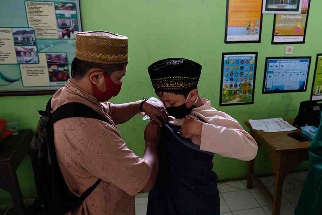 Peserta khitan masal gratis memakai sarung dibantu ayahnya setelah selesai dikhitan di Desa Kaloran, Kecamatan Kaloran Kabupaten Tem..