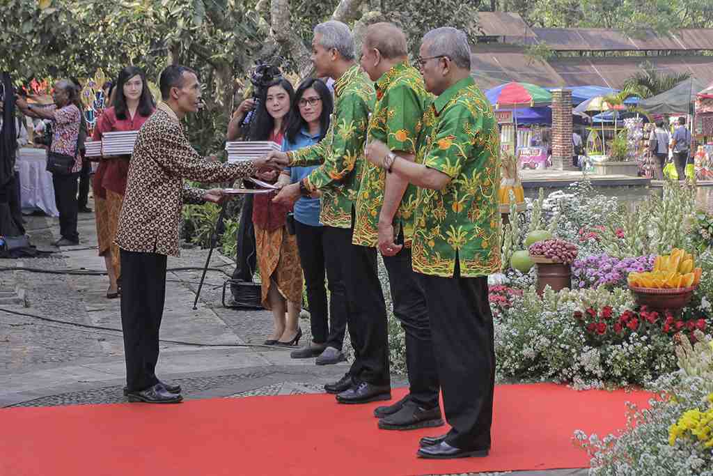 Gubernur Jawa Tengah Ganjar Pranowo (ketiga kanan) memberikan hadiah Lomba penyuluhan bidang pertanian tahun 2019 pada kategor..