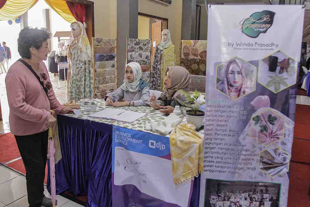 Dua orang karyawan Sita (kanan) dan Aulia (kedua kanan) menjelaskan sebagian proses pembuatan ecoprint handicrafts natural&..